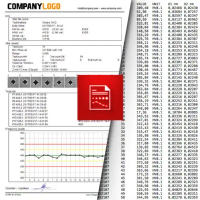 Customizable test report and information. Put as much sample information as you need, including pictures of the indents and test area. Examine results, statistics, and CHD diagram.